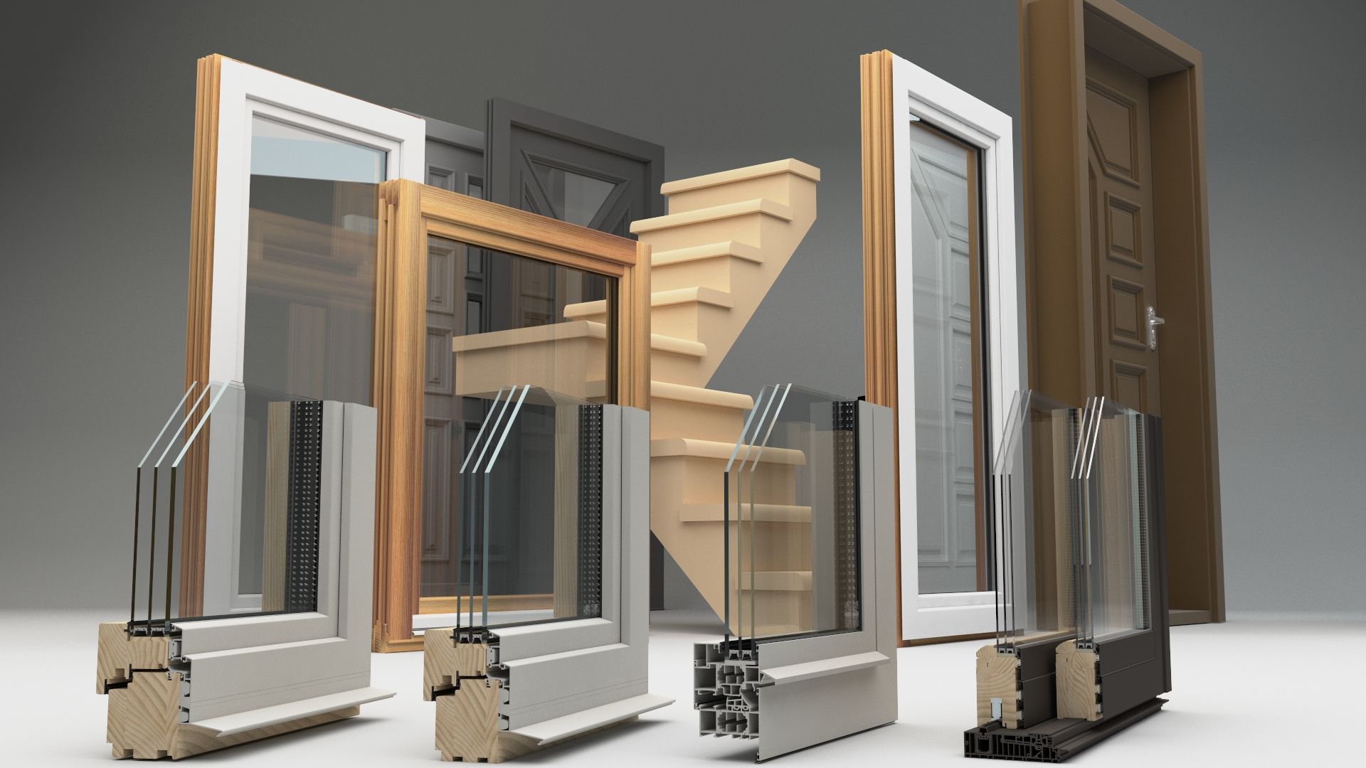 - Drvo: Drveni profil debljine 90 mm je od kvalitetnoga drveta (smreka/jela/ ariš/hrast/ meranti/bor), lijepljen bez vidljivog dužinskog spoja; za bolju prilagodbu s opremom enterijera, prozor se može izraditi iz različitih vrsta drveta.
